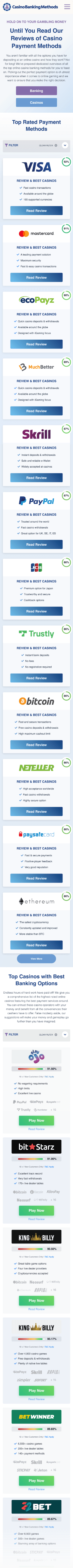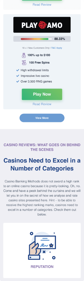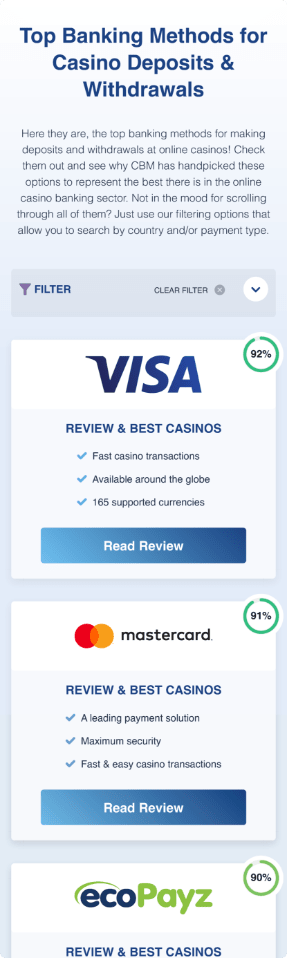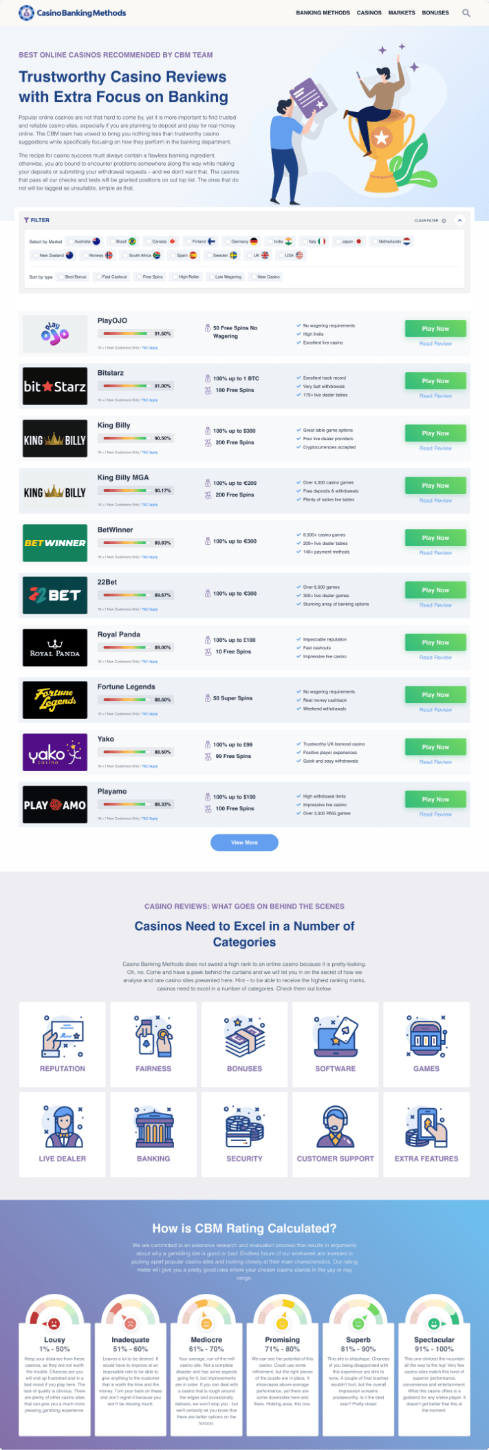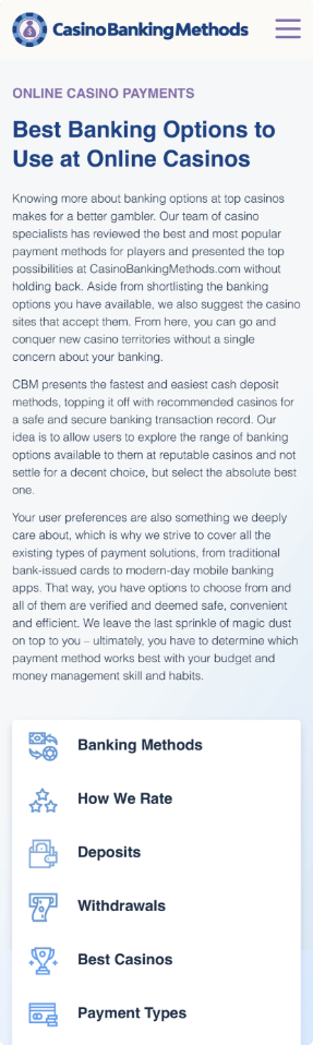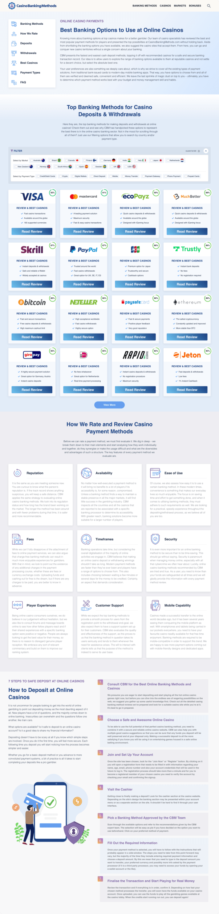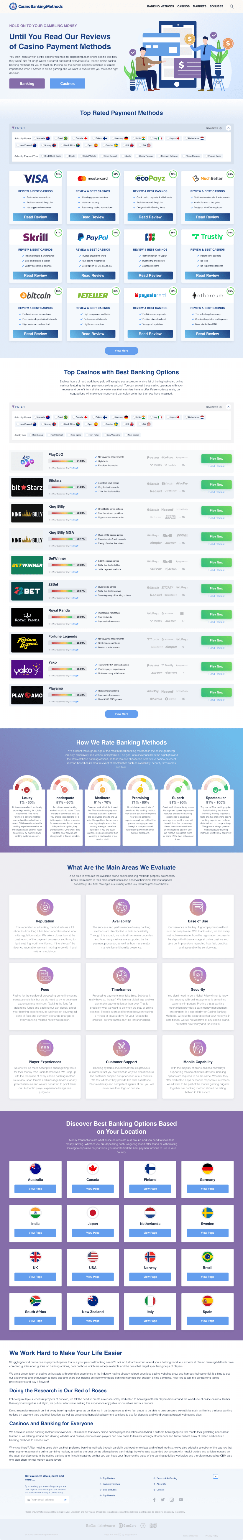 CasinoBankingMethods.com is a casino affiliate website focused on reviewing deposit & withdrawal options fo online casinos. The platform allows you to compare different payment methods based on your preferences and to choose the best casinos that fit your preferred way to deposit and withdraw. The site is driven on a custom-made WordPress theme optimised for high-speed performance & great score for google web vitals.