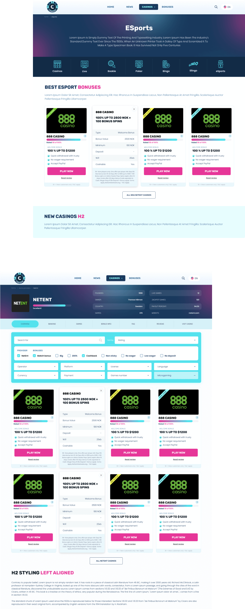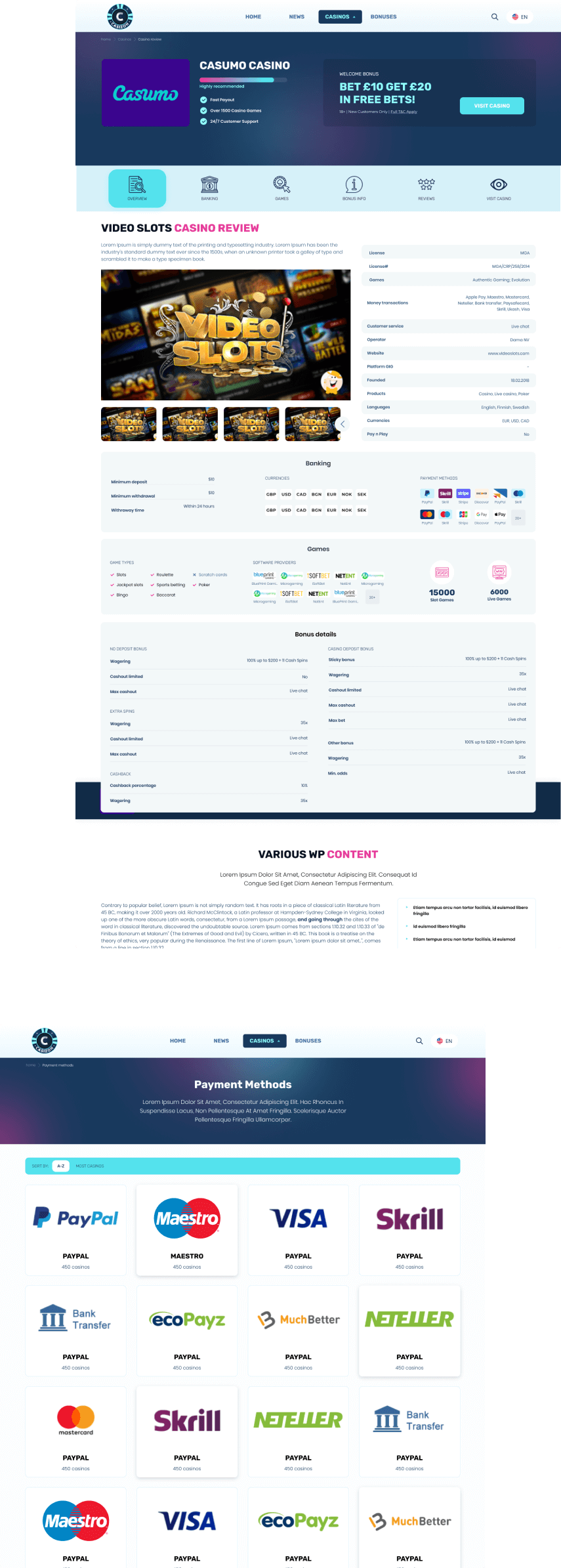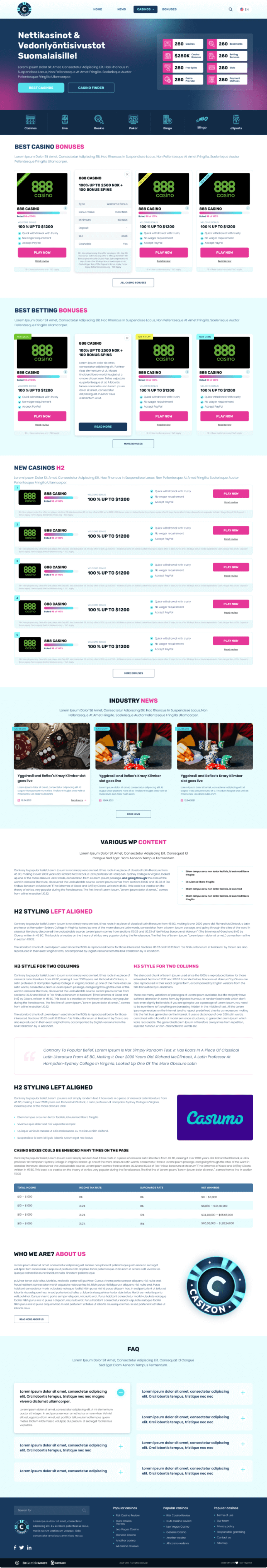 We were hired to make branding, logo and web design as this is the initial launch of the project. Casizon is driven on a custom wordpress theme with WMPL support for the multi language features. It has advanced filtering tool and detailed casino reviews.