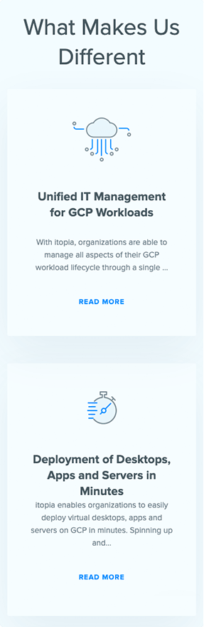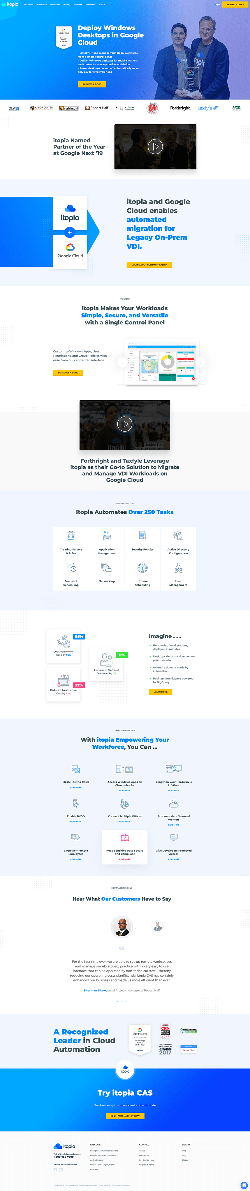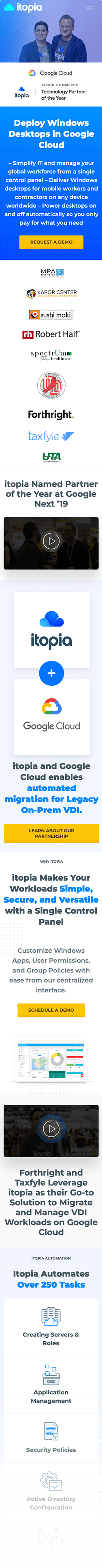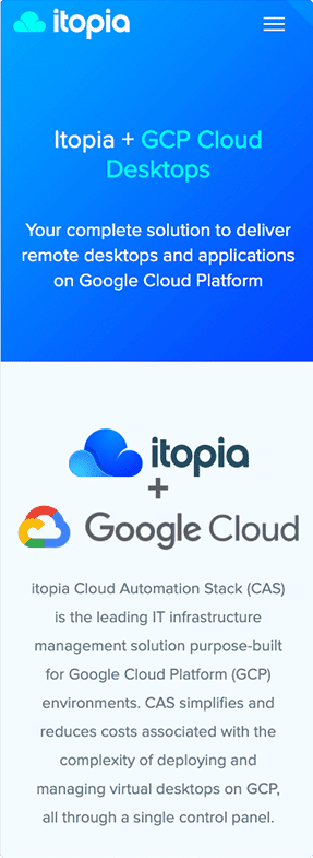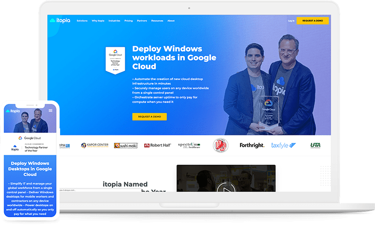 Itopia is premium Google Cloud partner, leading reseller of Cloud Desktop services in Australia and our long-term customer. We were involved in the entire process of designing and developing their marketing website over the years. The site is driven by WordPress and their theme is fully responsive.